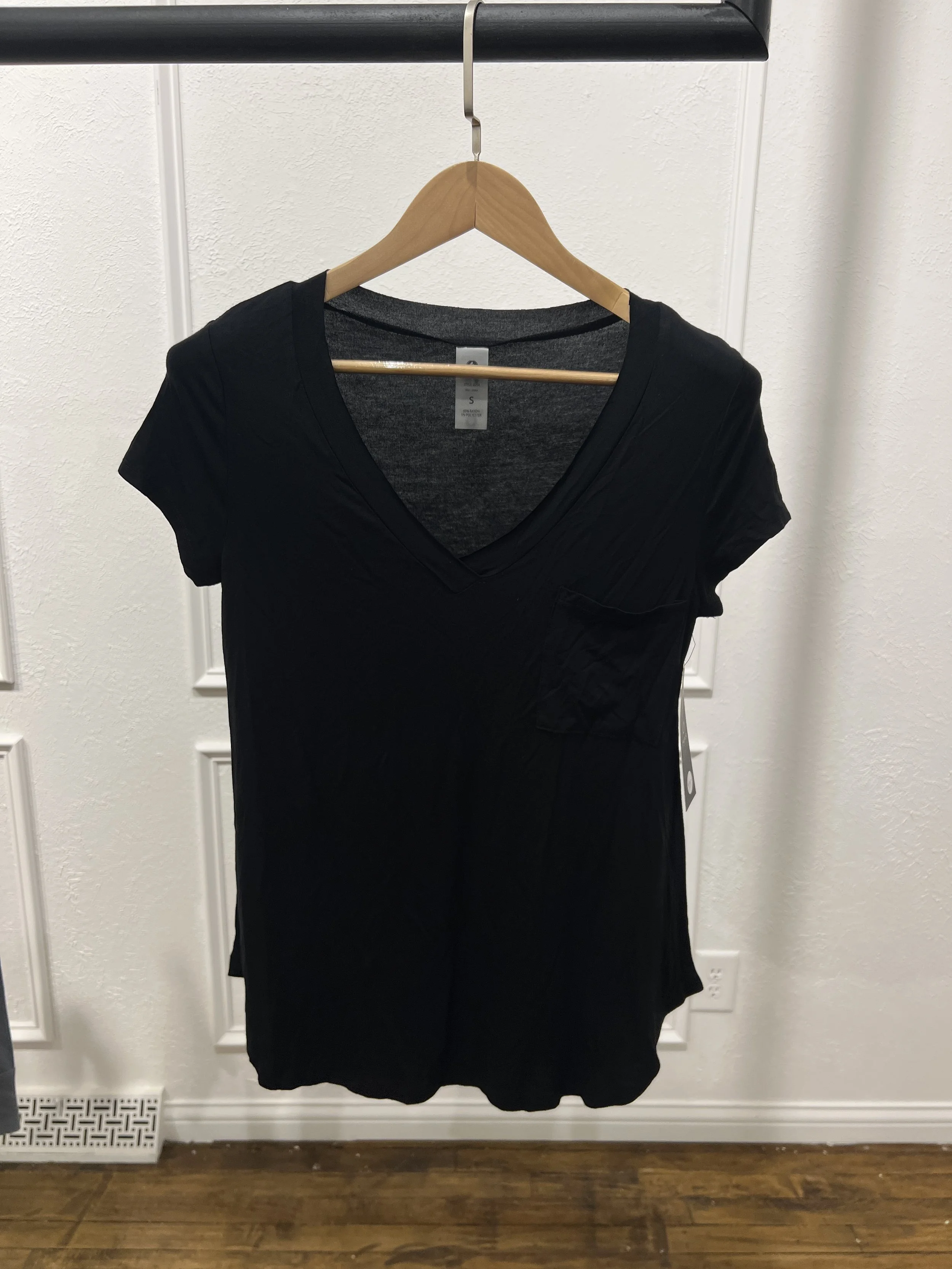 SHOP › 8254 V-Neck Basic Pocket Tee Short Sleeve (BLACK) Image 1 of 2 Image 2 of 2 8254 V-Neck Basic Pocket Tee Short Sleeve (BLACK) $30.00 Material:95% Rayon, 5% Polyester Size: S M L Quantity: Add To Cart Added! Material:95% Rayon, 5% Polyester